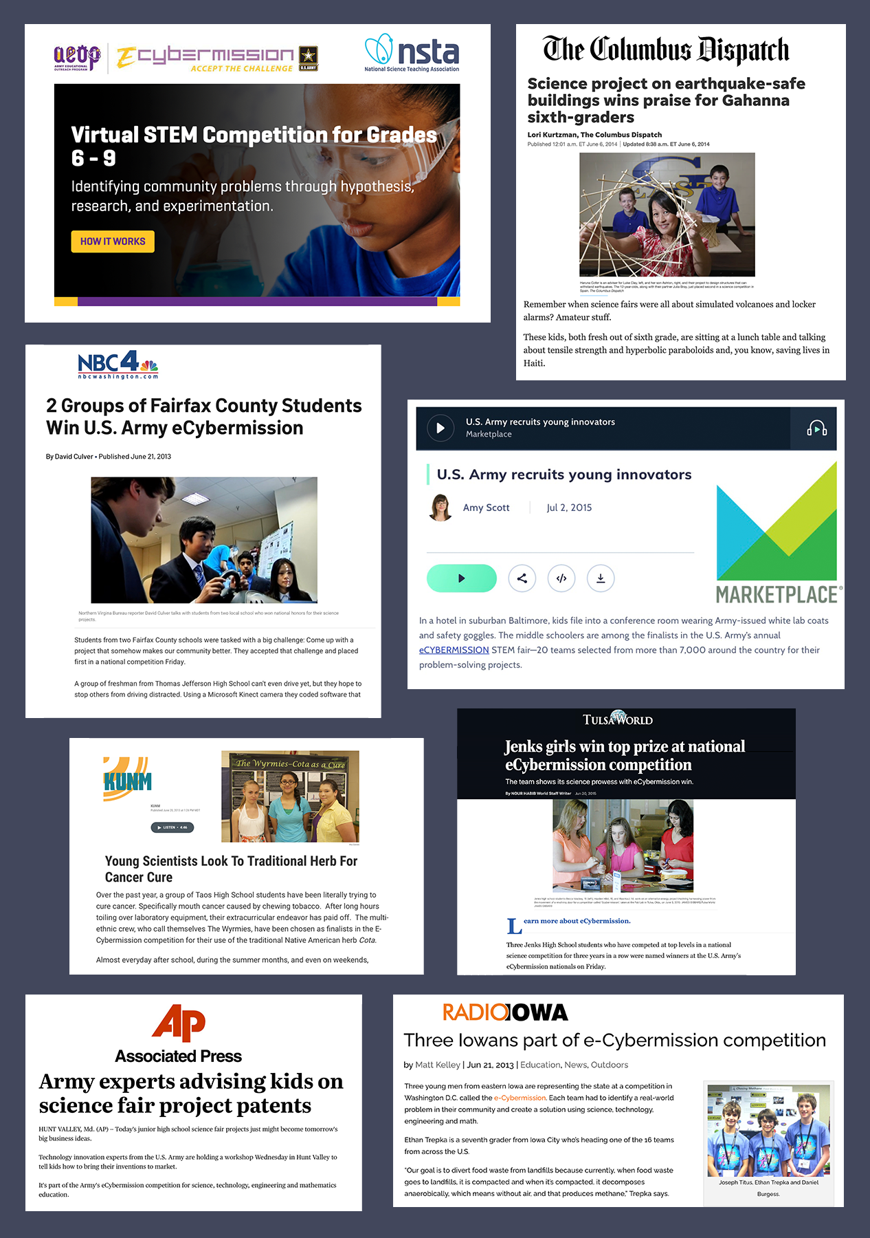 Over three years, Peitho secured around 200 pieces of media coverage nationwide, from NYC to Guam, including stories on the Army’s innovative approach to nurturing STEM skills by Associated Press and public radio’s Marketplace, and feature stories on finalist teams by leading daily newspapers, major-market television news, and statewide radio networks, most with visuals and interviews, and many with eCybermission in the headline.